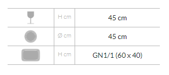 Taurės aukštis 45 cm, lėkštės aukštis 45 cm, skardos aukštis GN1/1 (60x40)