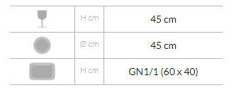 Taurės aukštis 45 cm, lėkštės aukštis 45 cm, skardos aukštis GN1/1 (60x40)